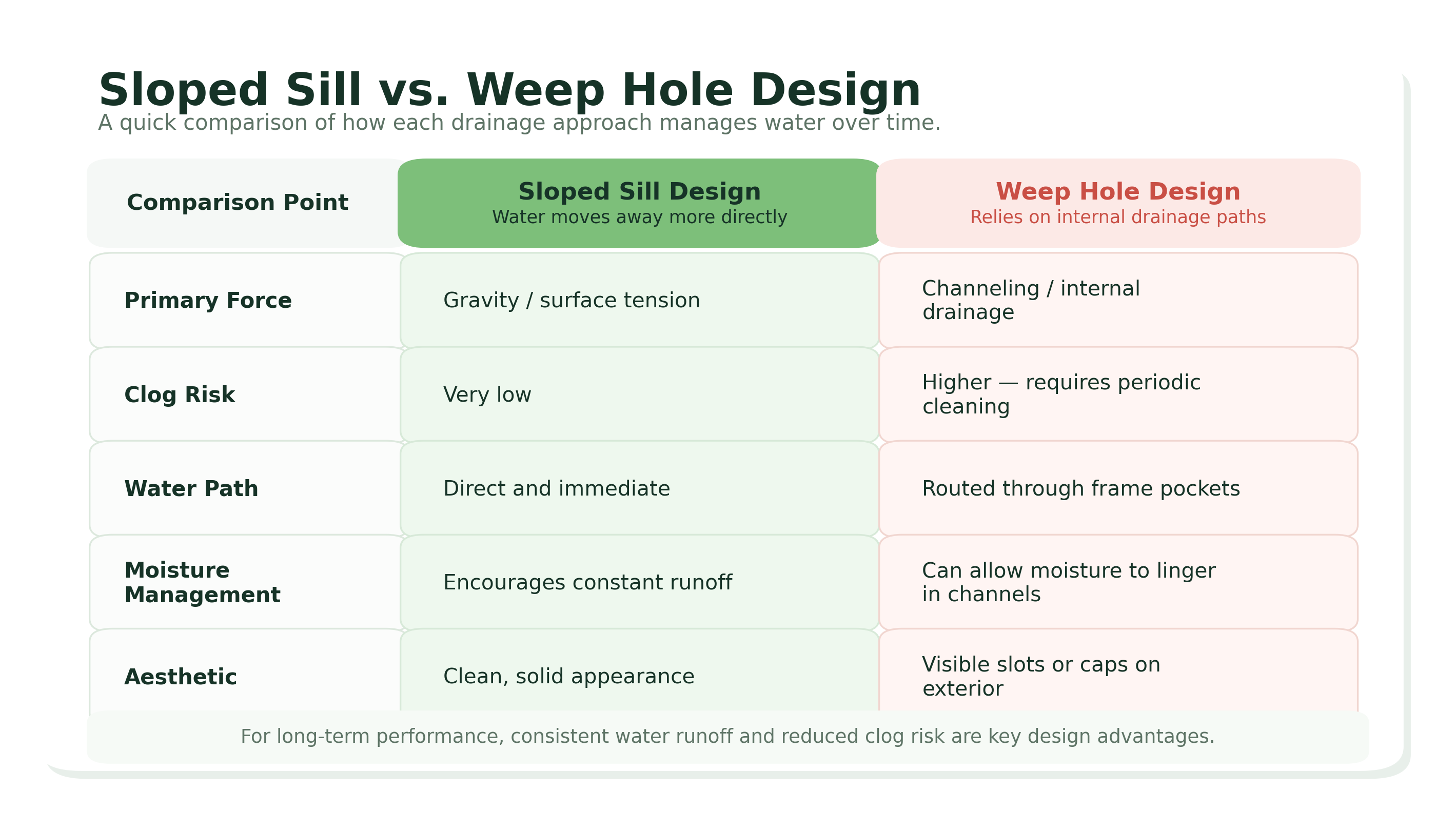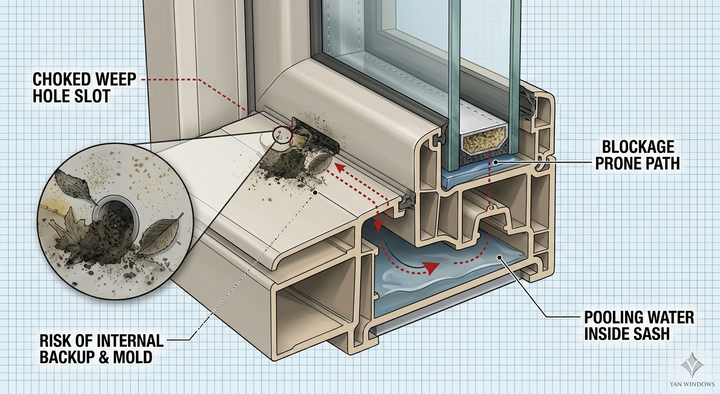 For example, some window systems rely heavily on weep holes to help water escape. Drainage systems like that can work, but they also depend on the drainage path staying clear. If those openings become blocked by dirt, pollen, debris, or lack of maintenance, water management can be affected.